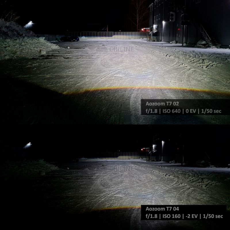 Нижний рефлектор дает очень яркое и широкое горячее пятно, но в тоже время пятно не растянуто по вертикали и не дает ближнего пересвета. Яркость горячего пятна очень высокая, даже выше чем у большинства трассовых моделей, причем горизонтальный угол засветки горячего пятна у светодиодных би-ледов T7 шире, чем у трассовых в 2-3 раза и составляет порядка 10 градусов.