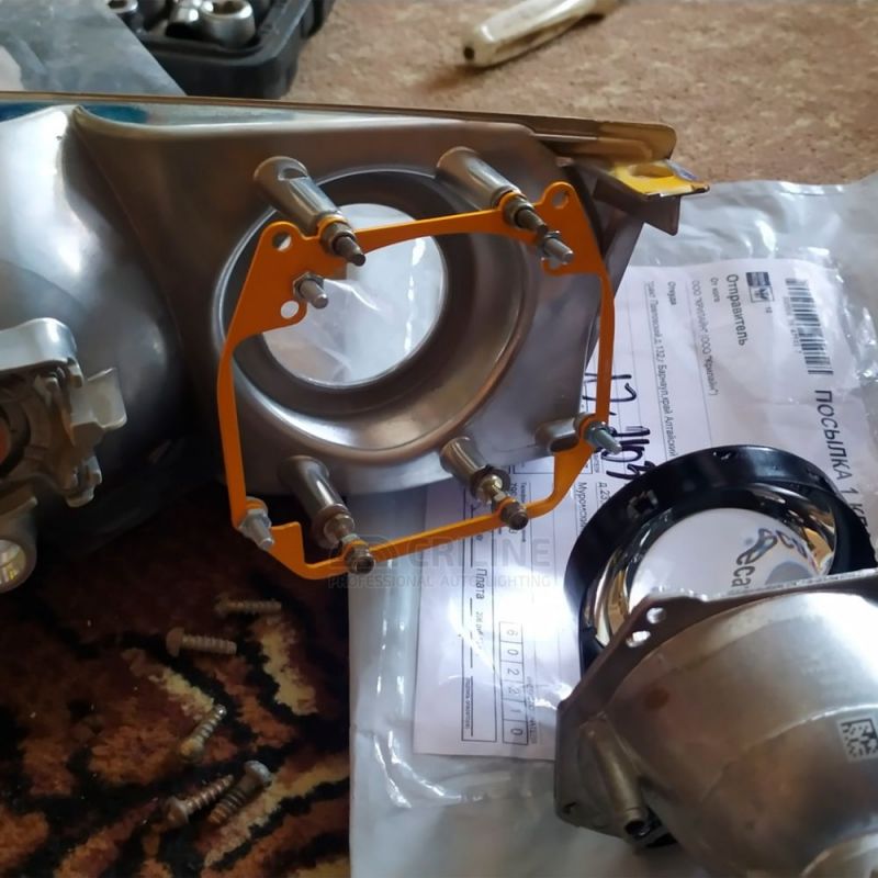 2. Старый линзованный модуль демонтируется и вместо него устанавливается новый модуль Hella 3R 5R, который крепится к штатным отверстиям с использованием переходной рамки.