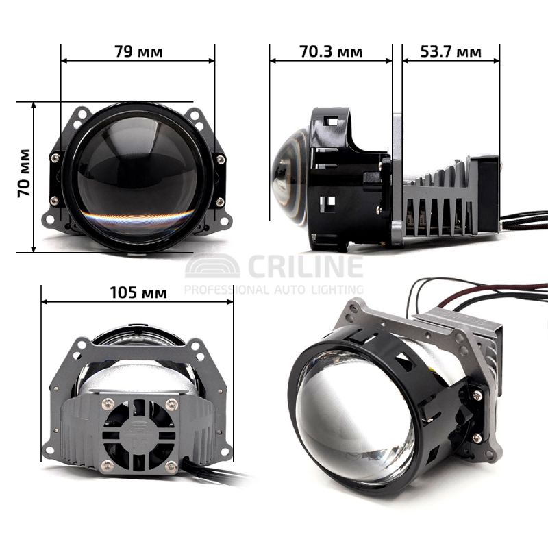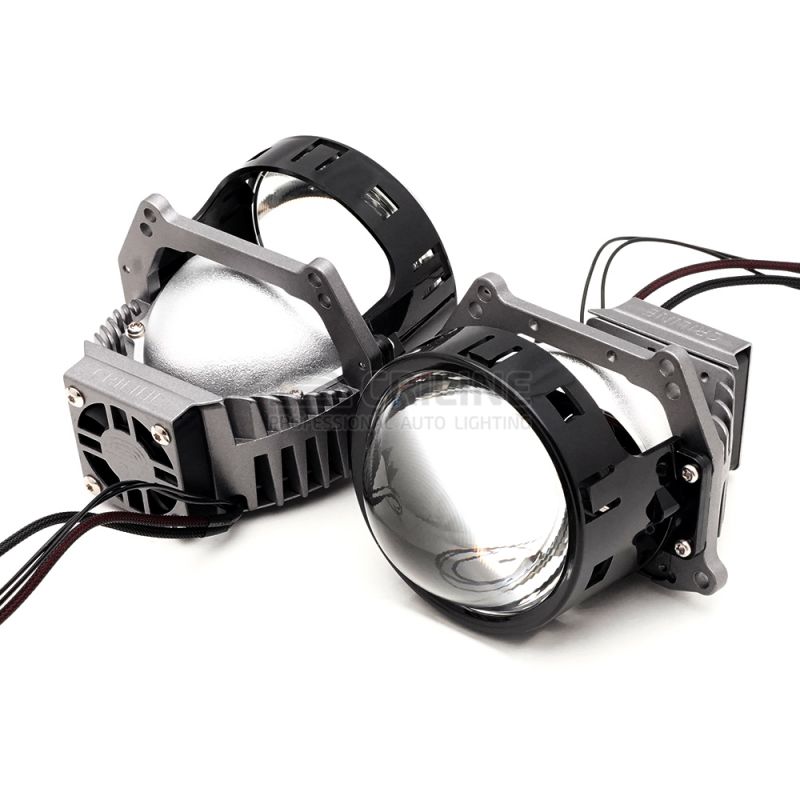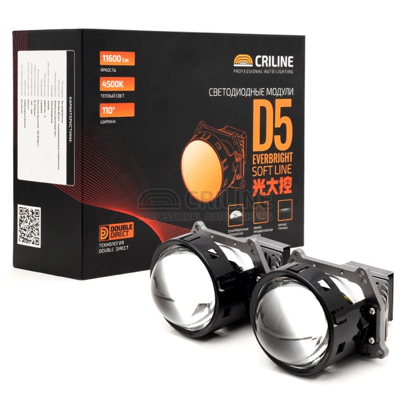 Би лед модули Criline D5 Everbright Soft Line с теплым светом. Nрехдюймовые двухчиповые светодиодные би-лед линзы мощностью 58 Вт на ближнем и 65 Вт на дальнем. Данные модули можно установить через переходные рамки Hella 3r/5r либо в рефлекторные фары через хвостовик-гайку.