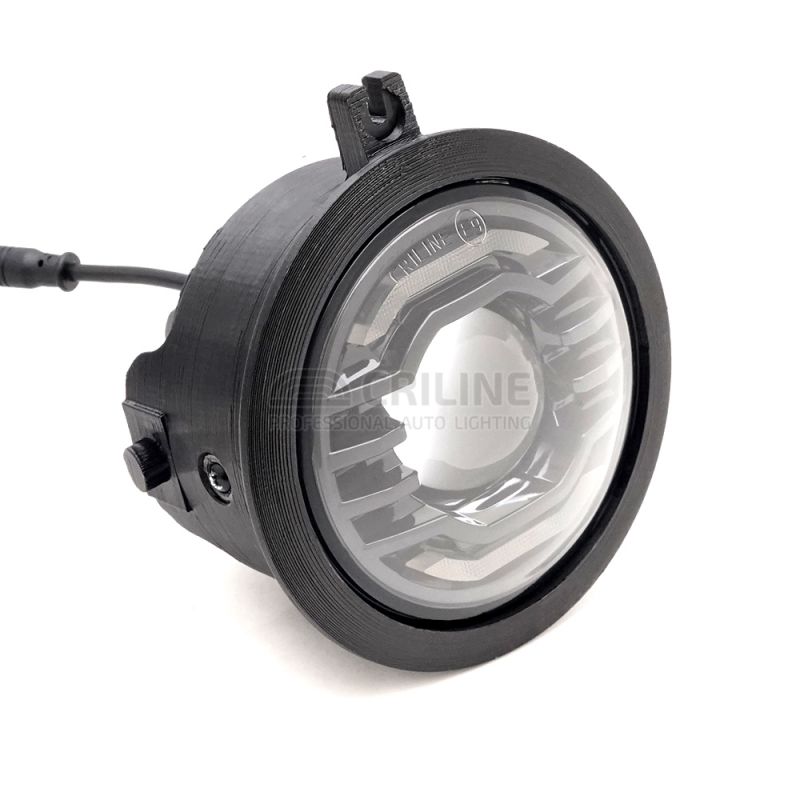 В этой "туманке" мы используем специальный чип 5050 мощностью 30 ватт с малым размером эмиттера 1.7 мм, что позволило нам получить чрезвычайно узкую линию первичной топовой засветки порядка 0.5 градусов и 3 градуса вторичной засветки. Такие углы недоступны даже в полноценных 3-дюймовых Bi-LED линзах.