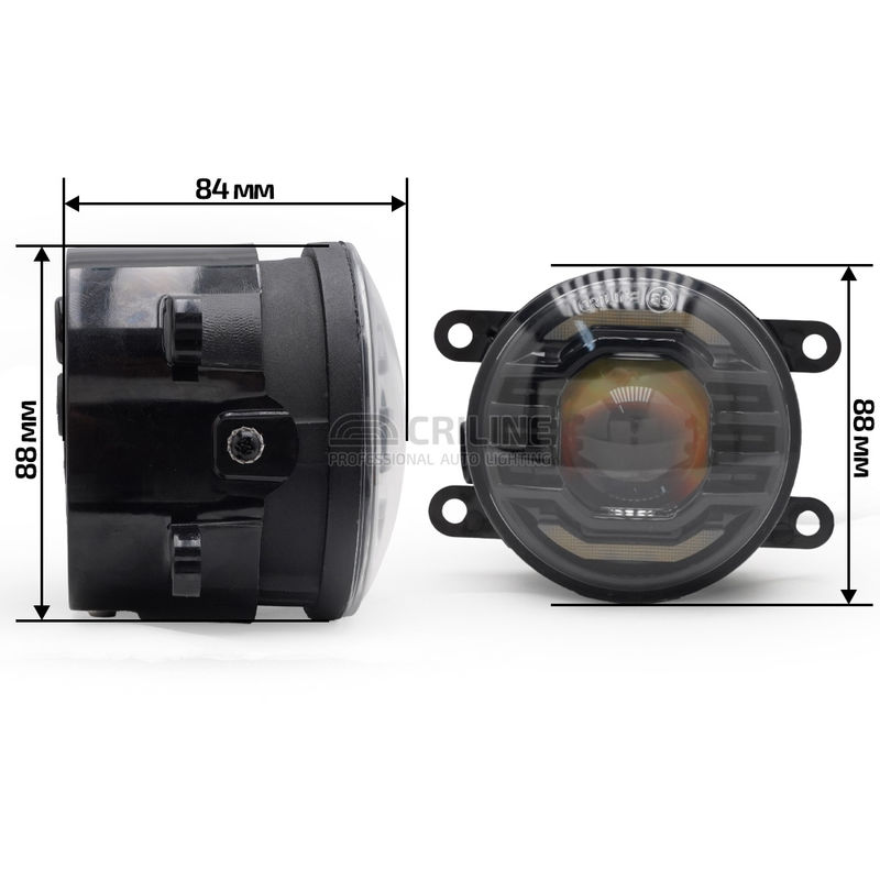 В этой "туманке" мы используем специальный чип 5050 мощностью 30 ватт с малым размером эмиттера 1.7 мм, что позволило нам получить чрезвычайно узкую линию первичной топовой засветки порядка 0.5 градусов и 3 градуса вторичной засветки. Такие углы недоступны даже в полноценных 3-дюймовых Bi-LED линзах.